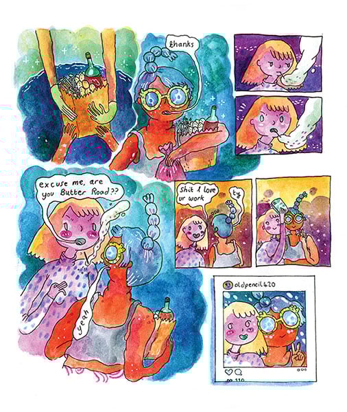 This issue features the beautiful watercolor comics of Beck Tobin! Follow lead singer Butter Road as she deals with the successes and turmoil of life in a band -- and the sentient musical instrument she baked in her kitchen!?