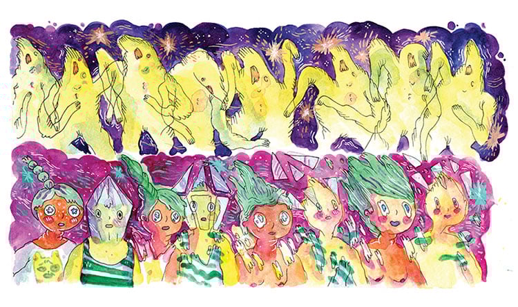 FROM REVIEWS:"Tobin’s style is beautiful in an oozing, unsettled kind of way. Vivid, unpredictable watercolors make the images from Frontier #9 jump off the page. Tobin’s organic wobbly line, lumpy characters, and bright colors make the whole reading experience feel a little psychedelic and disconcerting."